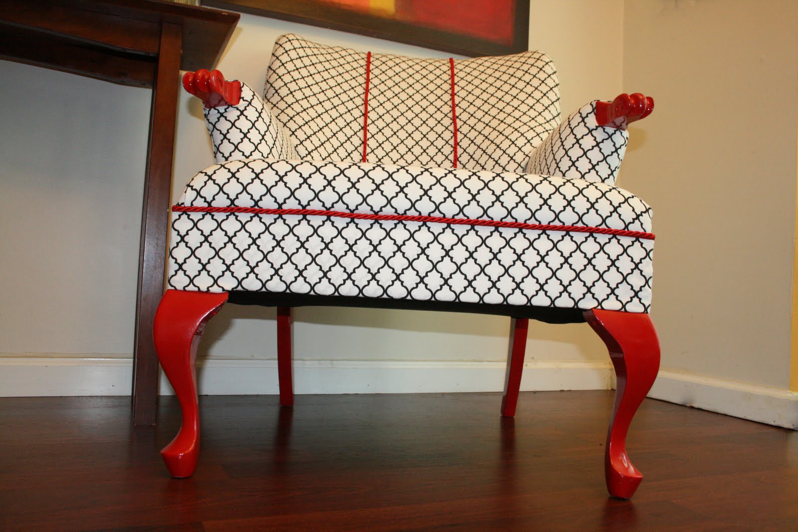 SO AFTER SOME WOOD GLUE, WOOD FILLER, A COUPLE COATS OF KILZ, AND GLOSSY RED PAINT, NEW FOAM, NEW BATTING AND DACRON, NEW WEBBING,